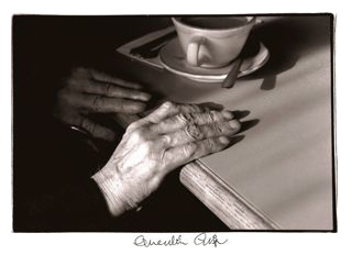 Quentins hands are wonderful to view, especially the one taken during one of their afternoons together at Cooper Square Diner and at home. The other images are a selection of a series Marty took of Mr. Crisp in the act of becoming Quentin Crisp. First, though, it was the morning pour of Guinness into his 1947 mug with the naked image of himself holding a daisy and with the quote, wrapping around the cup, Be gay rather than wise. Also, preparing his face with makeup and lipstick was only one of the aspects of this daily action which took nearly threes hours to do. Traveling with Quentin was wonderful, because I witnessed this amazing magic every morningfrom his soiled dressing gown to the familiar polished image.